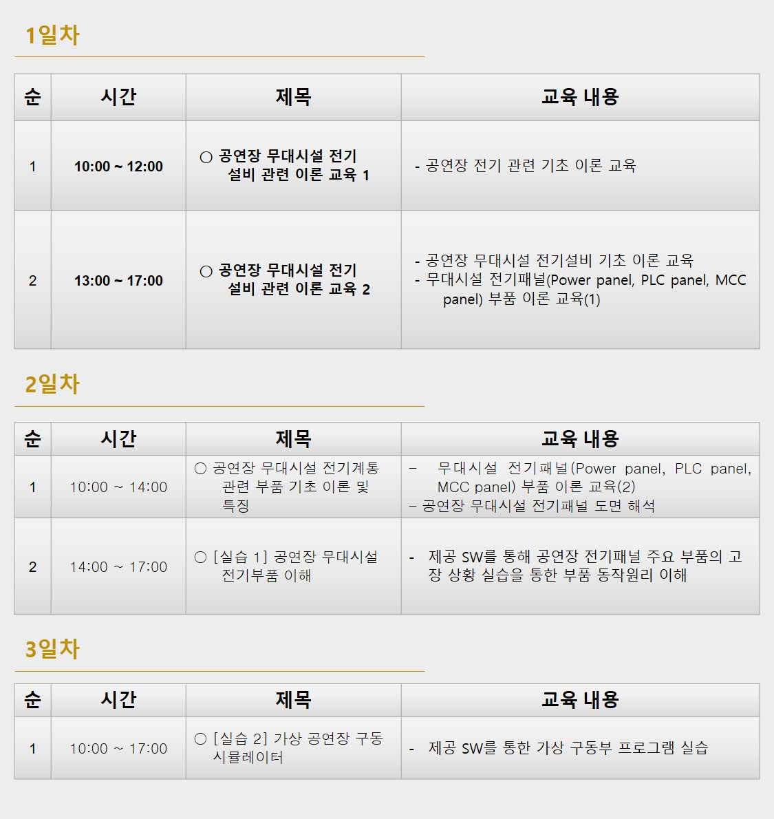 - 교육 대상 : 공연장 무대기계 운영자 또는 공연장 전기계통에 관심있는 분 (1년~3년차) / 초급단계의 교육이니 참고하시기 바랍니다.