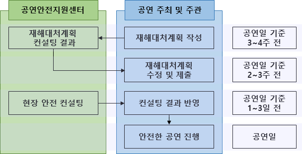 - 공연법 제11조(재해예방조치)에 따라 공연 특성에 맞는 재해대처계획 수립 컨설팅