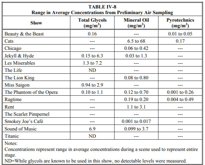 약 2배 농도로 인체의 폐에 잘 흡착되어, 건강상의 문제를 일으킬 수 있다고 설명 해 주었다. 특히, 6개월 이상 장기간 포그머신을 특수효과로 사용해야 하는 뮤지컬
