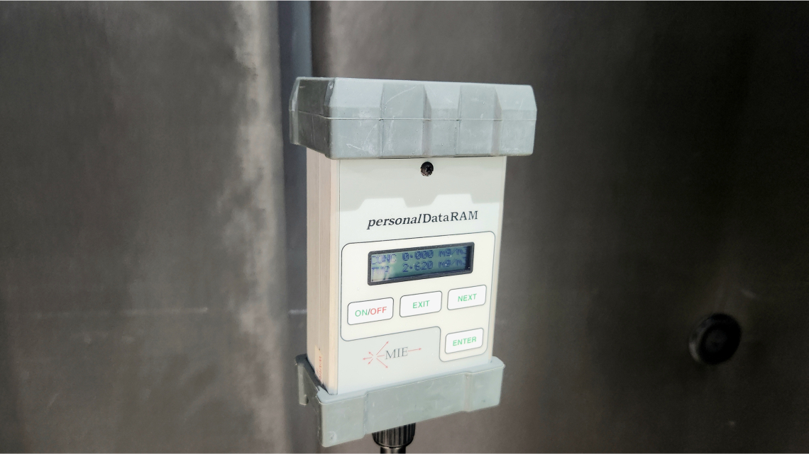 아래 사진은 실제 포그머신에서 나오는 연무 효과를 공기중 샘플링하여 글리콜과 미네랄 오일 미스트의 공기 중 농도를 측정 하기 위한 실시간 모니터링 측정기의 사용법을 설명하고 있다.