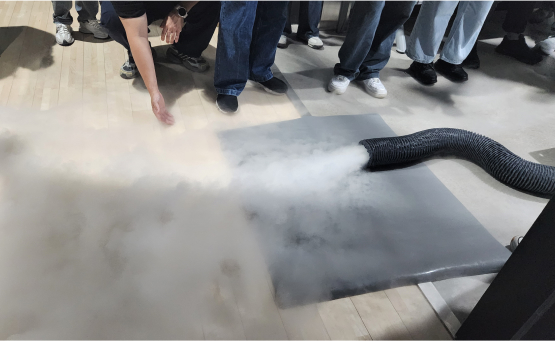 시연에 앞서 드라이아이스머신의 기본 구조와 작동 원리에 대한 간단한 설명이 진행되었다. 이어 드라이아이스 사용 시 유의사항으로 구매처, 사용 전 보관 방법, 사용 후 처리
